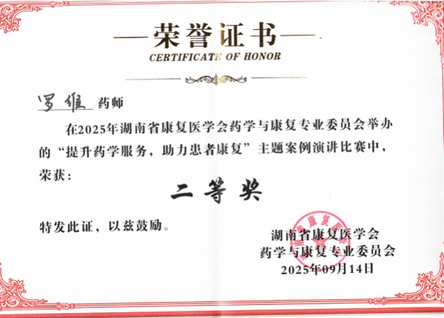 9月14日,由湖南省康复医学会药学与康复专业委员会主办、湖南省人民医院药学部承办的“提升药学服务,助力患者康复”药学服务案例演讲比赛在长沙成功举行。衡阳市中心医院临床药师罗维汇报的案例《多措并举、精准为纲——一例伏立康唑精准药学服务的实践与思考》,在全省11个参赛作品中脱颖而出,荣获二等奖,位列总分第二。