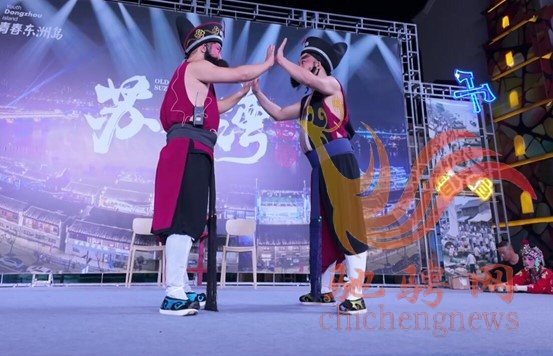湘剧《跟着鲁智深闯衡阳》在苏州湾老街上演。