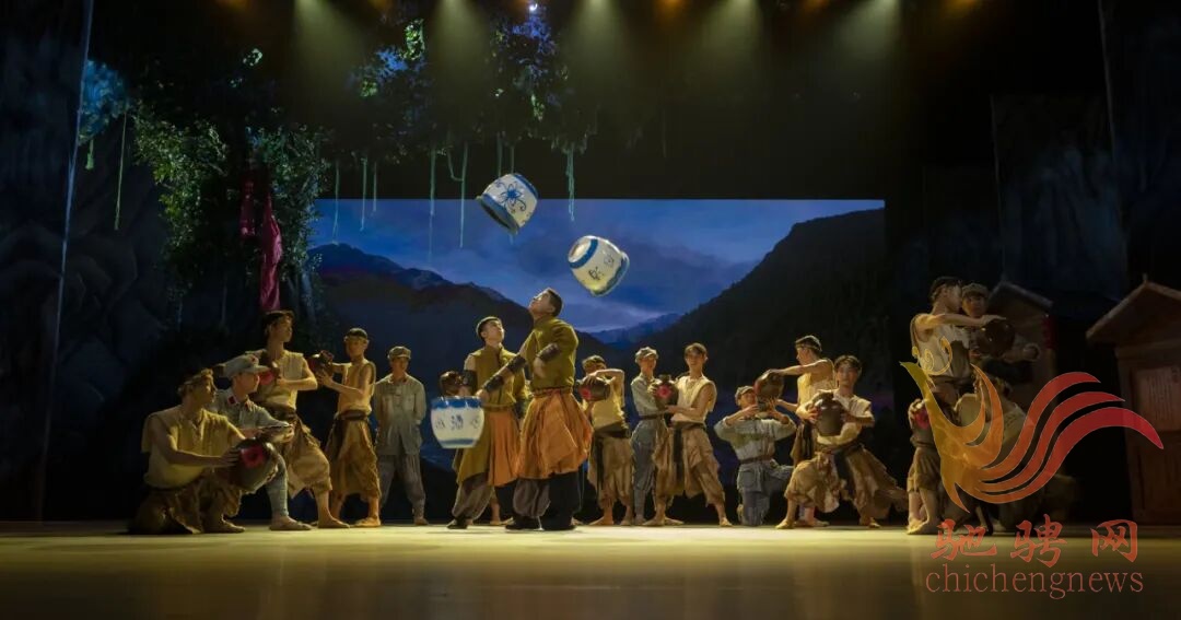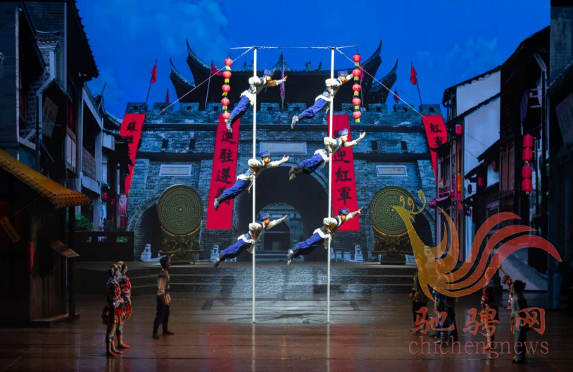 杂技戏剧化的生动表达,将剧情不断推向高潮、扣人心弦。中幡、滚灯与黔北傩戏融合,首先将观众带入一个久远的仡佬族祭祀活动,沉浸在浓郁的民族文化氛围之中。喜迎红军,爬杆挂标语、踏歌踩高跷、戏球舞狮、蹬鼓表演,热闹的场景栩栩如生,观众仿佛就是其中一员。欢庆遵义会议,空竹、转碟与黔北花灯交相辉映,生动表现了这一历史时刻军民的喜悦心情,尤其是阿牛为争取入伍与竹生的杂技较量,生动体现了坚定地跟党走的信念。表现四渡赤水和娄山关大捷,立绳、皮条、滑索、飞叉、腾空翻等杂技技巧彰显出独特的优势,将伟人的运筹帷幄、战争的激烈残酷、红军的勇敢无畏表现得淋漓尽致,给人以身临其境的强烈震撼。赤水河畔弥漫着酱酒的醇香,乡亲们用酒为红军疗伤,酒工们即兴表演坛技,军民鱼水情扑面而来。运用肩上芭蕾表现竹生与阿月的爱情别离,惟妙惟肖,美到极致,为升华后来的情感故事埋下巧妙的伏笔。“红军菩萨”的故事感天动地,高空杂技绸吊表现红军卫生员的牺牲,唯美而哀婉,让这一历史的真实更加生动感人。尾声“丰碑”,运用杂技力量造型再现红军战士在烽火硝烟中的各种英雄姿态,如梦如幻,触发想象,实现了大写意的完美表达,观众的思绪和情感在这里得到升华。