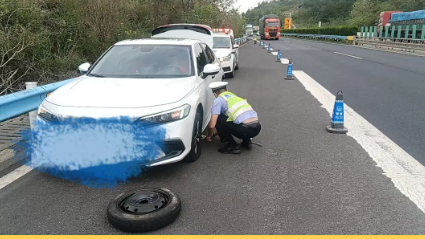 10月2日13时许,文女士驾驶小客车准备前往茅台机场接朋友,行驶至蓉遵高速上行428公里路段时,小客车左前轮胎突然爆胎,车辆无法继续行驶。文女士当时不知道如何处置,万分焦急。此时,遵义市公安交通管理局高速交警四大队三中队巡逻组民警罗曦、辅警蒲青飞驾驶警车巡逻经过此处,他们立即停车上前询问。