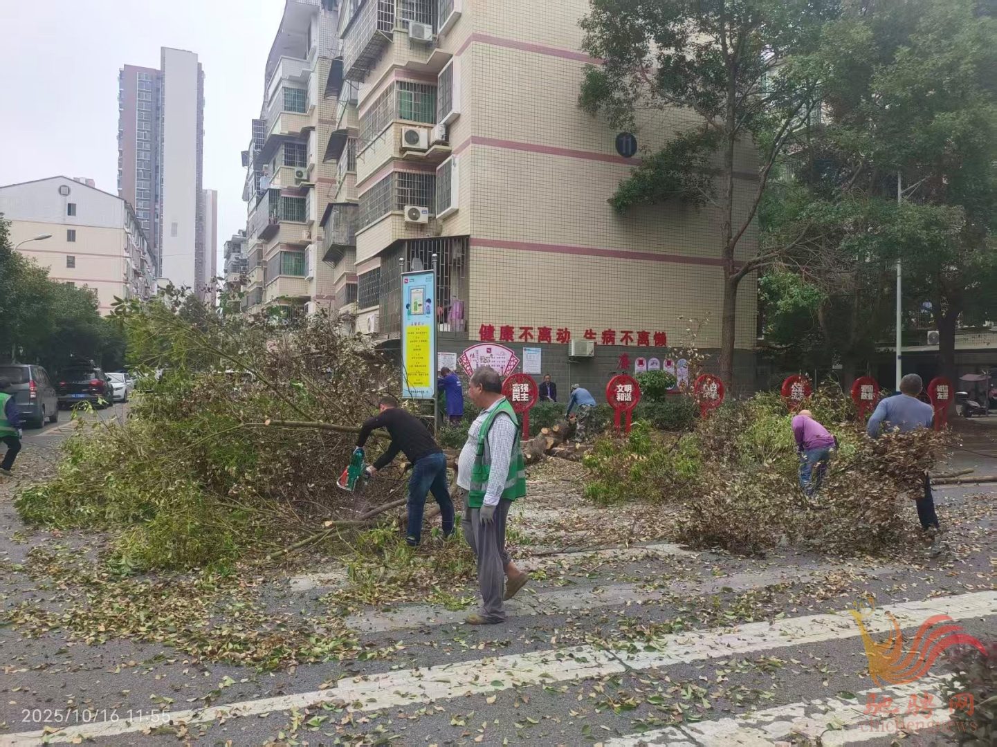 10 月 16 日上午,衡阳市雁峰区金龙坪街道金龙社区携手园林公司,积极开展绿化专项整治行动,30 余名社区工作人员与园林专业人员共同参与,对金龙安置小区内的枯死树木进行集中清理,并同步进行绿化修剪与养护工作,旨在全面消除安全隐患,提升小区整体环境,为居民营造安全、整洁且宜居的生活环境。