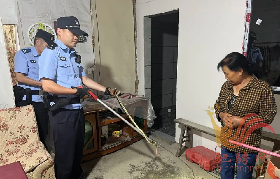 “有一条蛇钻进我家卧室了,现在找不到它在哪,我们根本不敢睡觉!”近日,湄潭县公安局永兴派出所接到群众紧急求助,电话那头的群众声音带着明显慌乱。接警后,值班民警顾麒麟第一时间组织警力,迅速配齐捕蛇工具、防护装备,以最快速度赶往位于永兴镇德隆村的求助群众家中。抵达现场后发现,蛇患发生在农户家的卧室里——房间内堆放着不少杂物,空间本就狭小,加上夜间光线有限,给蛇的搜寻工作增加了极大难度。为避免蛇受惊逃窜或伤人,民警顾麒麟带领队员小心翼翼地排查每一个角落,从床底到墙角,再到家具缝隙,不放过任何一处可能藏匿的地方。