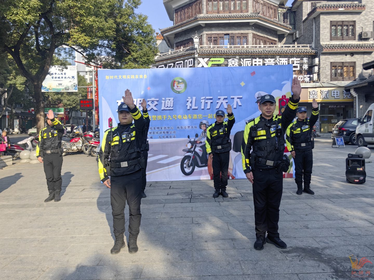 12 月 1 日上午 9 时,南岳牌坊广场的 “文明交通 礼行南岳” 主题活动拉开帷幕。活动伊始,铁骑队员表演的交通手势操吸引众多目光,迅速点燃现场氛围。随后,交警结合当地典型事故案例,向群众详细讲解佩戴头盔、拒绝逆行、反对酒驾以及持证上路的重要性。