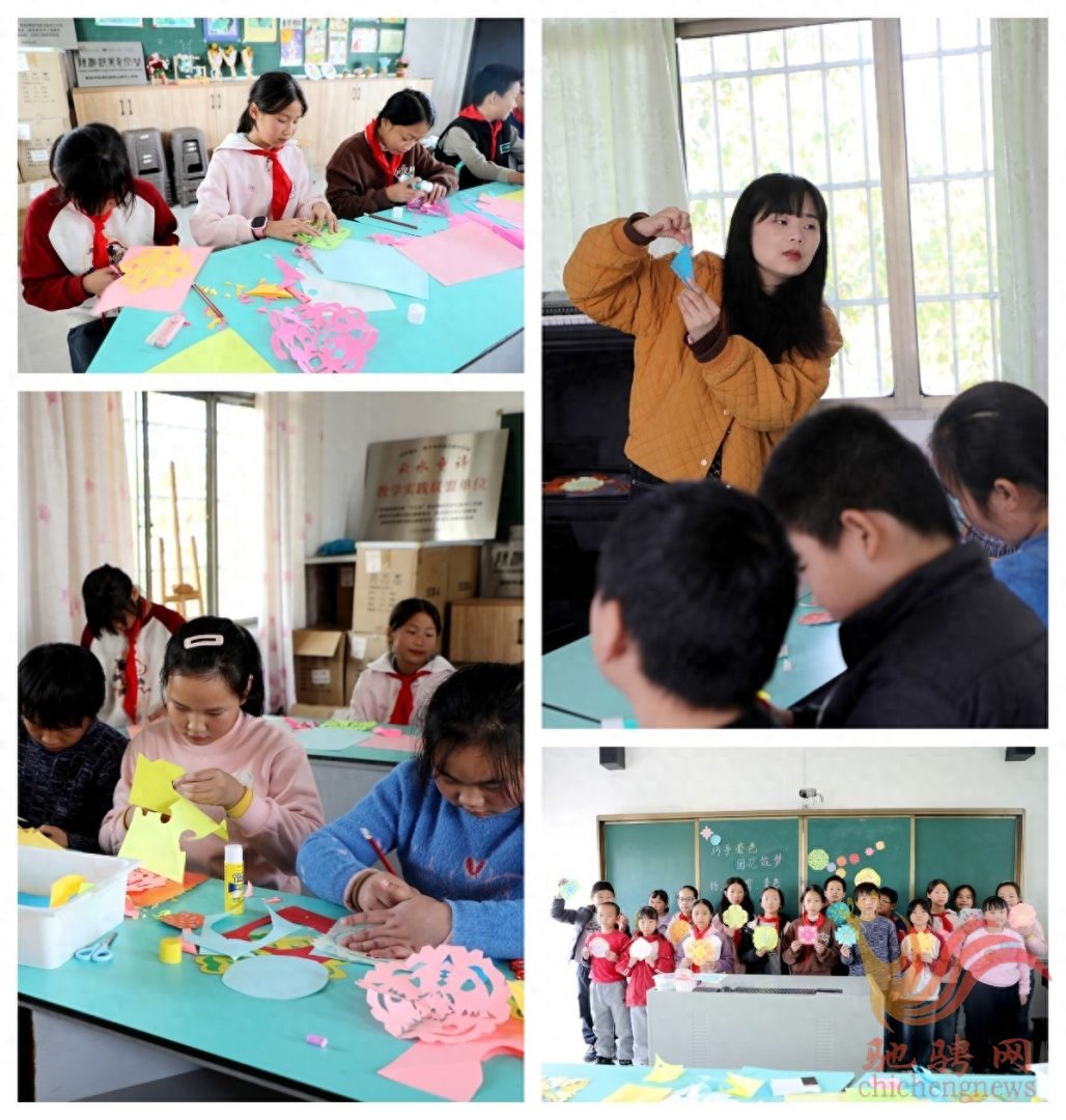 “孩子们,你们看,用小剪刀从这里开始剪,搭配好颜色,再重复背面粘贴的操作,是不是就学会‘套色’剪纸的方法啦?”11月20日,走进雨母山镇梓木小学的剪纸课堂,曾楚雪老师正手把手地教孩子们剪纸,孩子们拿到彩纸后跃跃欲试,自由发挥丰富的想象力,时而认真思考,时而相互交流,左一刀,右一剪,一张张彩纸在掌心流转,现场充满了欢声笑语。
