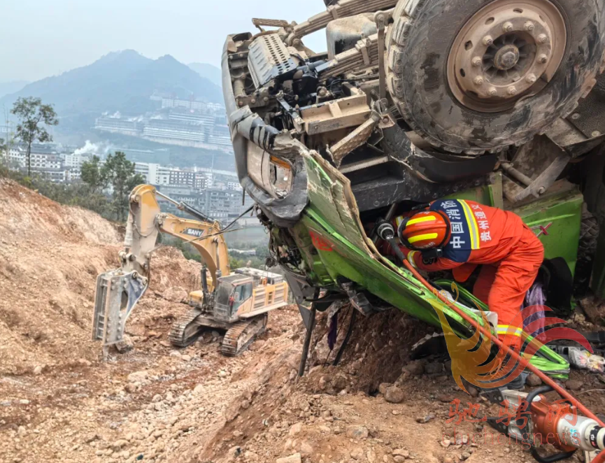 司机被困在变形的驾驶舱内 尽管意识清醒 但双腿仍被卡在金属构件之间 动弹不得 由于车头位置的地面已出现细微裂缝 且碎石不时滚落 车身随时可能出现再次滑落的危险