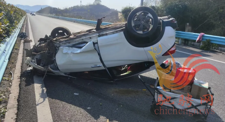 民警抵达现场时,看见一辆渝B籍小型轿车横向仰翻在玉新高速公路下行143Km处的快车道内,车辆右前轮已经脱落、车头被撞得面目全非、车内气囊全部弹出,所幸事故没有造成人员伤亡。