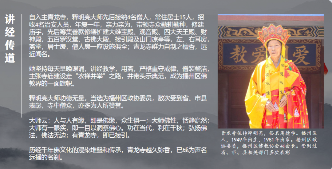 青龙寺的住持大师释明亮,27岁皈依佛门潜心修持普渡众生,她坚持重守戒律,主张寺庙建设走“农禅并举”之路,带头示范成为播州区佛教界的一面旗帜!信众均言青龙寺住寺僧众有法有德,致青龙寺名扬四海,来朝拜者皆慕名而来,在释明亮法师历经三十三年苦心经营下,将青龙寺一步步建造为清幽古雅规模宏大的寺庙,释明亮大师功德无量,心怀慈悲、福泽众生,这,就是佛心吧……