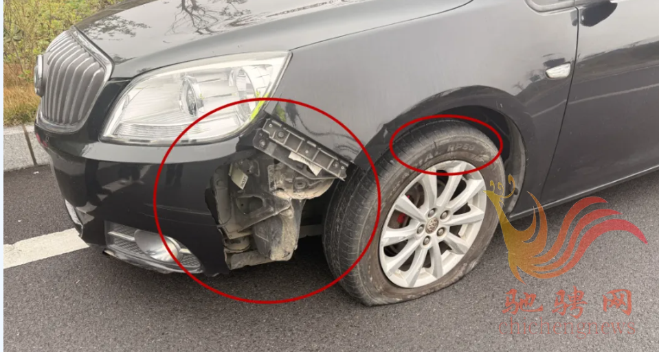 民警抵达现场时,警情所述的黑色小轿车已驶入服务区内,该辆悬挂临时号牌的小型轿车左前侧遭遇磕碰导致左前车轮爆胎和翼子板受损,驾驶人与乘客均安然无恙。
