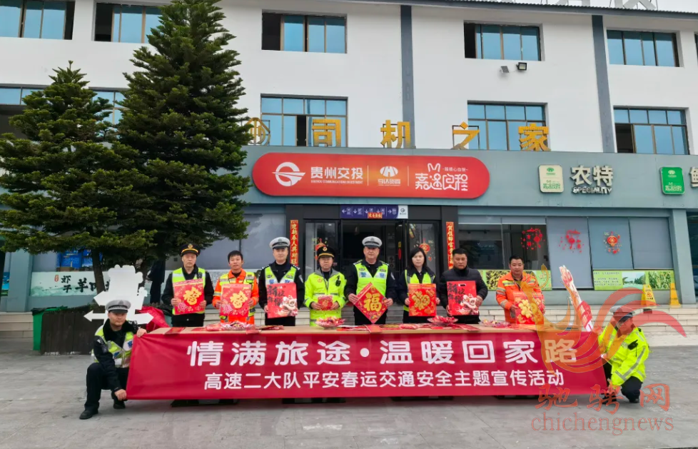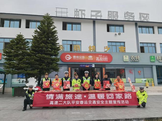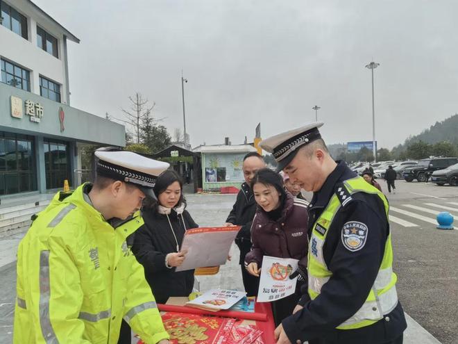 为切实保障春运期间高速公路交通安全畅通,全力守护群众平安返乡,2026年2月11日,遵义市公安局交通管理支队高速二大队以“情满旅途·温暖回家路”为主题,联合辖区综合执法大队、业主方、养护等部门在杭瑞高速公路虾子服务区开展平安春运交通安全主题集中宣传活动。