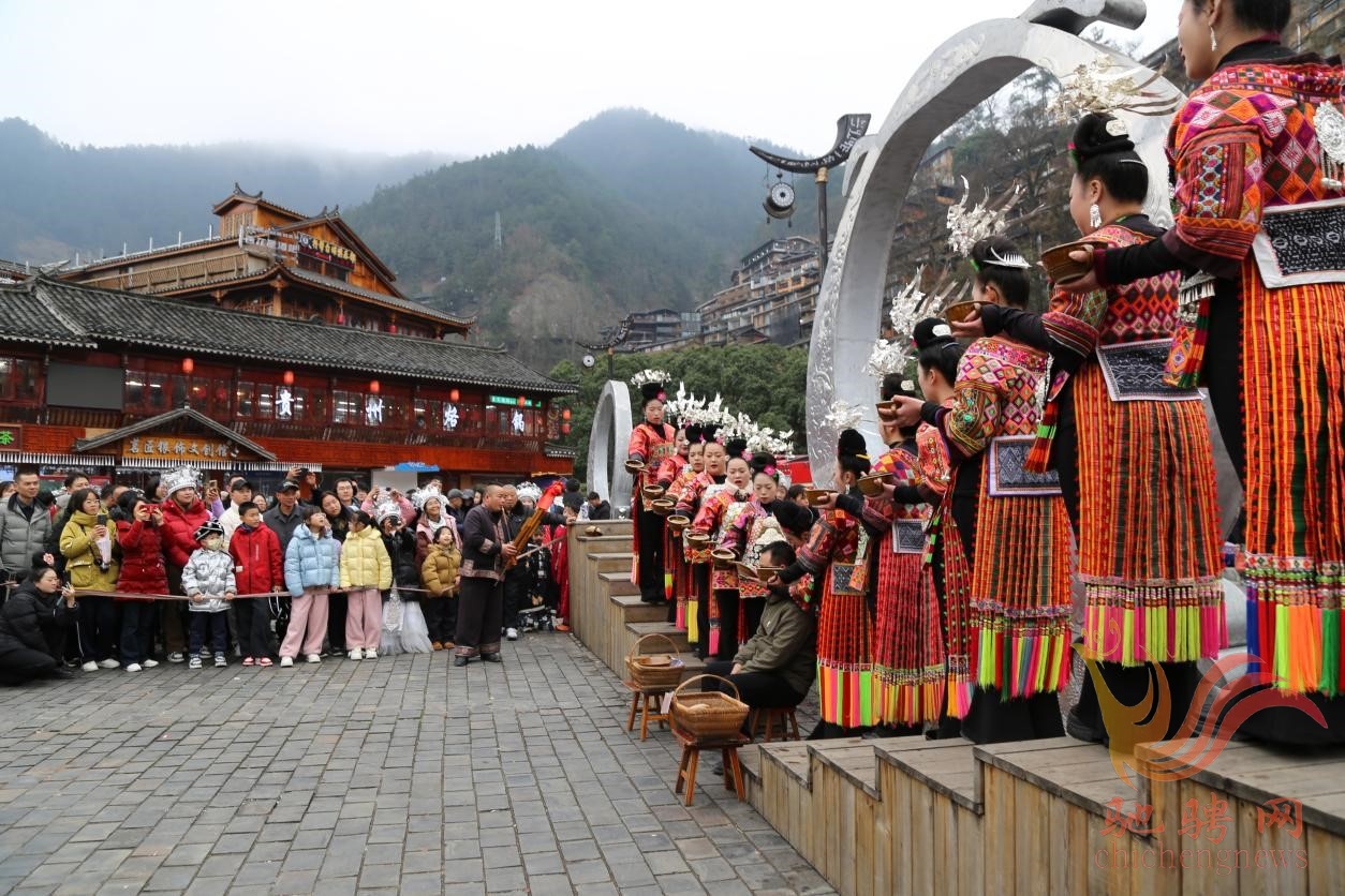 今年春节期间,西江旅游集团公司精心布局,在西江景区大北门、银项圈广场以及新西门广场等地,集中推出 “高山流水” 苗族独特敬酒模式体验活动。活动现场,芦笙声声,为欢乐的氛围增添了浓郁的民族风情;苗族敬酒歌欢快响起:“欢迎你到苗寨来,醇香米酒迎接你,你喜欢来一杯,不喜欢喝一杯,管你喜欢不喜欢也要喝……” 游客们置身其中,在苗家少女热情的劝酒中,感受着这份独特的文化魅力,纷纷陶醉其中,不少人还掏出手机记录下这难忘的精彩瞬间。