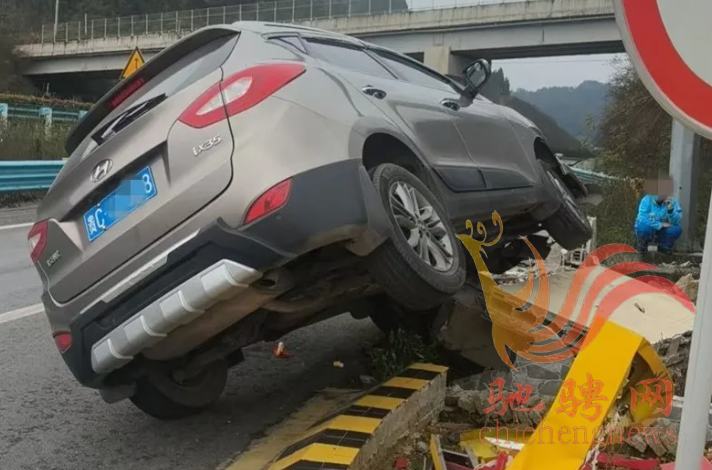 民警抵达现场后看见,报警人所驾驶的贵C籍小型普通客车停于服务区出口处。车辆部分车体位于被其撞毁的围墙废墟之上,导致车头右侧连同右前轮被碎石砖块架起,呈悬空状态。车辆车头右侧、引擎盖等部位受损,服务区出口的部分墙体被撞倒塌。