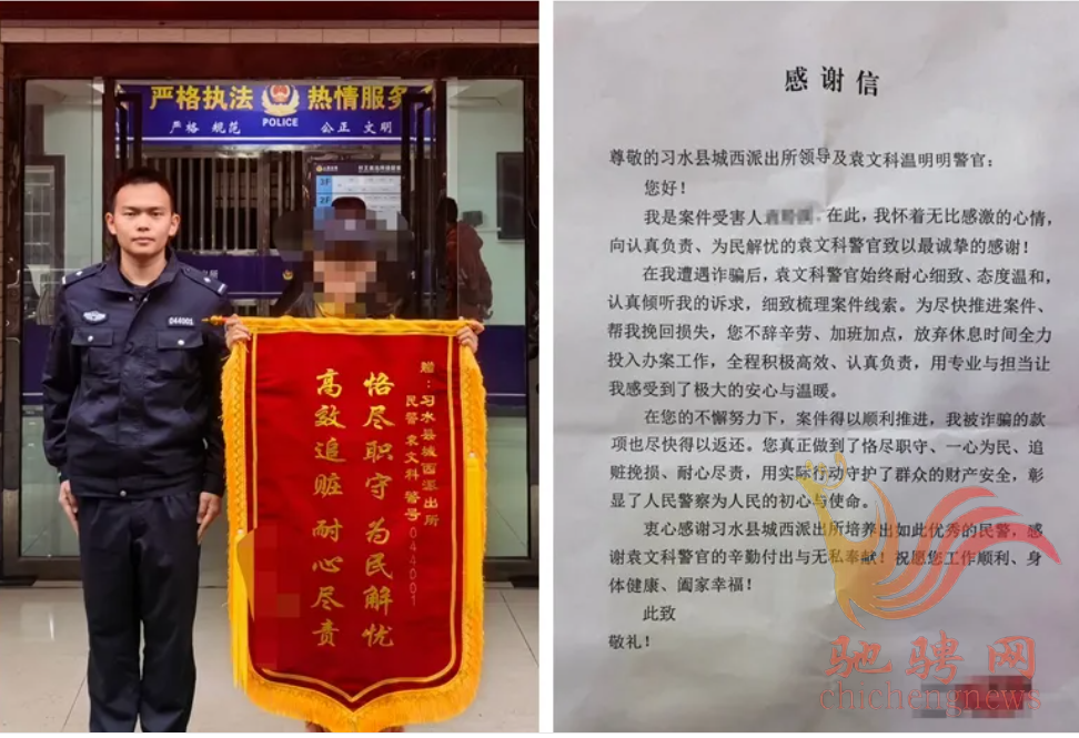 近日,习水县公安局杉王派出所收到一封感谢信和一面锦旗,群众以最真挚的方式,向杉王派出所民警袁文科、辅警温明明表达深深的感激之情。