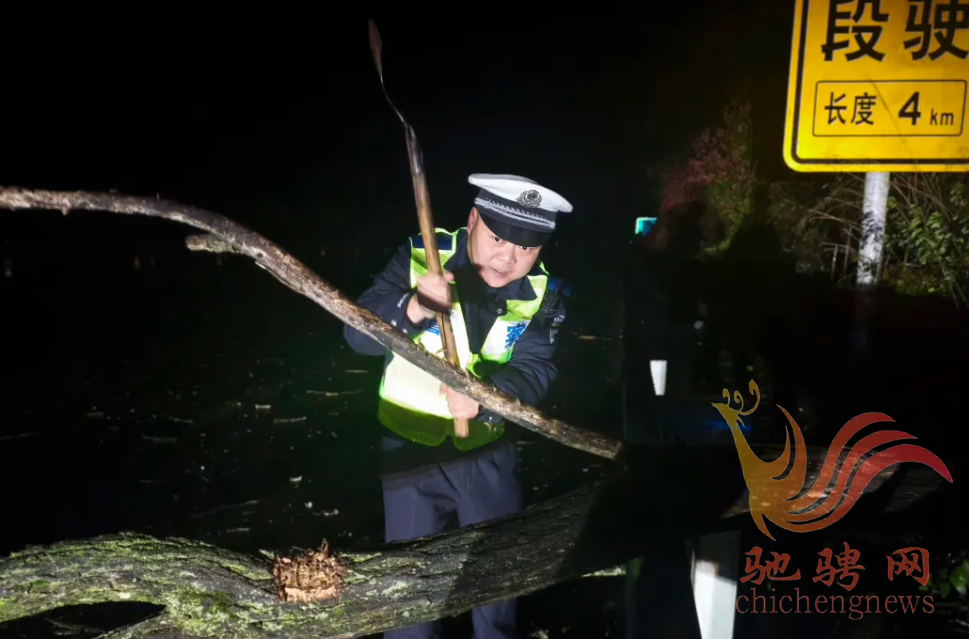 面对恶劣天气与复杂路况,执勤人员立即分工,设置安全警示区域,全力开展应急清障。因倒伏树木体量巨大,无法直接挪移,只能现场砍伐分段清运。