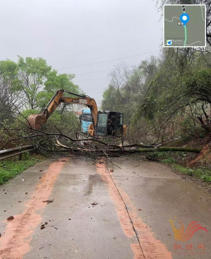 抵达现场,应急抢险人员不惧风雨,迅速展开清障作业。他们分工协作,用油锯对倒伏大树分段切割、分解,再通过装载机清运树干与残枝,整个抢险高效有序推进。经近 1 小时奋战,上午 11 时 30 分,路面障碍物清理完毕,受阻路段恢复通行,保障了群众顺畅出行。