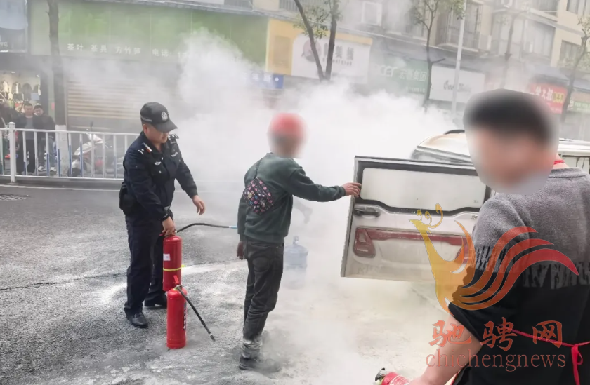 接报后,民警立即从学校值班室拿上灭火器赶到现场,发现车辆还在燃烧,且不时有车辆和行人经过,情况十分危急。见此,一名民警疏散过往车辆和行人,另一名民警使用灭火器迅速开展灭火。明火扑灭后,为防止发生复燃,民警再次对车辆进行反复检查和降温处理。