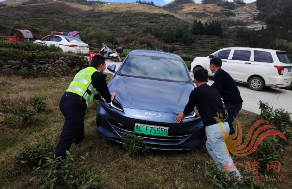日前,小雅派出所民警辅警在巡逻途中,发现一辆蓝色轿车陷入了辖区茶园旁的一处泥坑之中,两名驾乘人员多番努力始终无法脱困,于是赶忙上前提供帮助。经现场观察,因泥土湿滑,车辆左前轮深陷泥坑,为避免车辆进一步下陷,民警迅速与驾驶员合力推动车身,经过十余分钟的共同努力,成功将被困车辆推出泥坑。