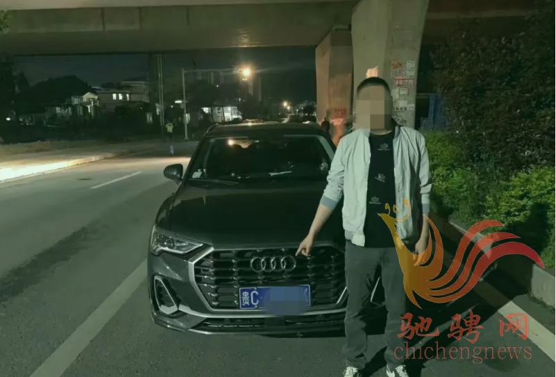 近日,仁怀市公安局交管大队民警在尚礼大道城南客运站天桥路段设卡检查过往车辆,对一辆黑色小型轿车驾驶人进行呼气式酒精检测时,检测仪闪烁红灯,该驾驶人有酒驾嫌疑。