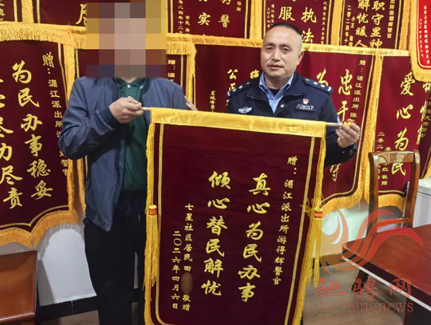 7日后,李女士从民警手中领回失而复得的手机,激动不已:“太感谢你们了,没想到真能找回来!”这起手机寻回事件,不仅挽回了群众财产损失,更体现了黄家坝派出所“小事不小看、小案不小办”的为民情怀。PART 02湄江派出所“贵哥调解室”:解开多年“疙瘩”,锦旗送给游德辉警官
