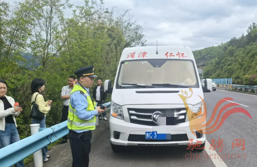 执法人员立即靠边停车,拉响警报。经询问,该车从湄潭前往仁怀,行驶中突发机械故障,无法继续行驶。车上共有8名司乘人员,其中一名乘客怀抱着仅数月大的婴儿。